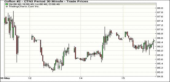 5月15日,受美元走高、外部商品市場(chǎng)普遍下跌拖累,紐約期棉全面中幅收低,主力7月合約結(jié)算價(jià)86.45美分/磅,跌47點(diǎn);12月合約結(jié)算價(jià)85.49美分/磅,跌67點(diǎn)。近期市場(chǎng)成交量持續(xù)清淡。當(dāng)日期棉平穩(wěn)開盤,主力合約早盤受外部市場(chǎng)走低拖累下滑至86.20美分一線,之后基本在86-86.4美分震蕩,盤終中幅收低,該合約近兩周基本在83.60-88.40美分/磅之間震蕩。遠(yuǎn)期12月合約當(dāng)日窄幅震蕩,盤終基本回吐了前一日的漲幅。