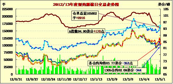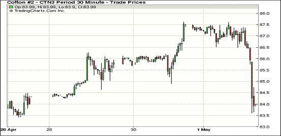 5月第一個(gè)交易日,經(jīng)濟(jì)數(shù)據(jù)低迷對(duì)商品市場整體形成壓力,紐約期棉結(jié)束四連漲大幅下跌,近期5月合約結(jié)算價(jià)82.09美分/磅,跌344點(diǎn);主力7月合約結(jié)算價(jià)83.87美分/磅,跌360點(diǎn);12月合約結(jié)算價(jià)83.04美分/磅,跌324點(diǎn);其他遠(yuǎn)期合約跌幅也均在200點(diǎn)以上。期棉當(dāng)日大部分時(shí)間運(yùn)行平穩(wěn),主力7月合約圍繞87美分/磅震蕩,后中國官方采購經(jīng)理人指數(shù)(PMI)顯示,中國4月份制造業(yè)活動(dòng)較3月份放緩,低于市場預(yù)期;同時(shí)美國制造業(yè)數(shù)據(jù)下滑也顯示制造業(yè)活動(dòng)擴(kuò)張速度放緩,這對(duì)市場造成打壓,期棉在尾盤時(shí)分大幅下滑并以陰跌收盤。外部商品市場也普遍大幅收跌。