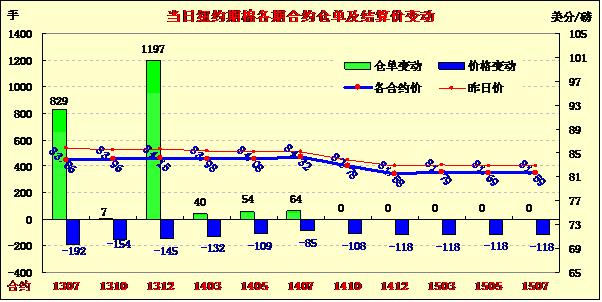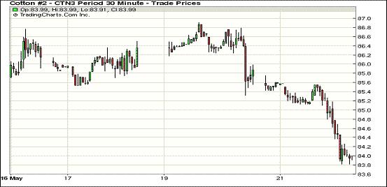 5月21日,受美元走強(qiáng)及外部谷物市場走弱影響,紐約期棉連續(xù)第二個交易日收跌,主力7月合約結(jié)算價83.86美分/磅,跌192點(diǎn);12月合約結(jié)算價84.15美分/磅,跌145點(diǎn);其他遠(yuǎn)期合約也普遍大幅收跌。市場成交量較前幾日有所放大。當(dāng)日期棉小幅低開,主力7月合約上半場在85-85.5美分/磅之間震蕩,后美元走高對商品市場整體施壓,期棉隨谷物市場回落,該合約當(dāng)日最低至83.82美分,盤終創(chuàng)5月1日以來最大跌幅,結(jié)算價為4月25日以來最低值。12月合約較7月合約升水29點(diǎn)。分析指出,美元指數(shù) 上漲,進(jìn)一步打壓以美元計價的原材料價格;此外長期遭遇旱情的德州西部短期內(nèi)將迎來降雨,有利于新花播種及生長,這對棉市形成打壓。