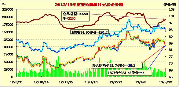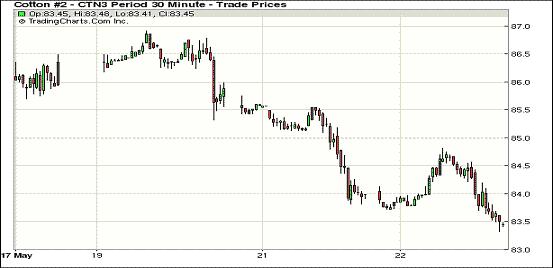 5月22日,紐約期棉近跌遠漲,主力7月合約結(jié)算價83.42美分/磅,跌44點;12月合約結(jié)算價84.39美分/磅,漲24點;其他遠期合約普遍微幅收漲。期棉隔夜小幅高開,主力7月合約早盤受買盤支持至當日最高點84.82美分/磅,下半場在買盤獲利平倉打壓下回落并以陰跌收盤,該合約在過去9個交易日中有7日走低。其他合約普遍微幅或小幅收漲,主要受前一日市場超賣回調(diào)支持。當日外部谷物市場普遍走低,原油期貨下跌。