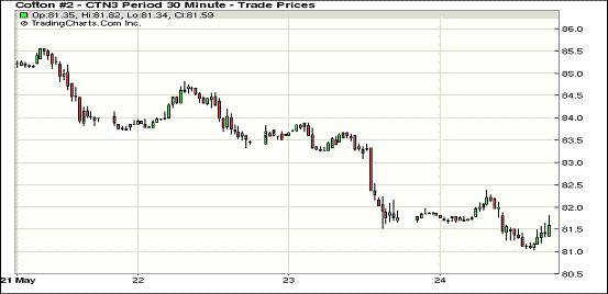 5月24日,紐約期棉近跌遠(yuǎn)漲,主力7月合約結(jié)算價(jià)81.49美分/磅,跌29點(diǎn);遠(yuǎn)期12月合約結(jié)算價(jià)83.77美分/磅,漲13點(diǎn);其他遠(yuǎn)期合約也普遍收漲。下周一(27日)為美國陣亡將士紀(jì)念日假期,紐約期貨市場將休市一天,28日恢復(fù)交易。當(dāng)日缺乏消息刺激,期棉整體運(yùn)行較為平穩(wěn)。主力7月合約當(dāng)日最高至82.38美分/磅,最低為81.03美分,震蕩幅度135點(diǎn)。該合約在過去11個(gè)交易日中有9個(gè)交易日收跌,當(dāng)周累計(jì)跌492點(diǎn);12月合約累計(jì)跌213點(diǎn);遠(yuǎn)期3月合約跌209點(diǎn)。