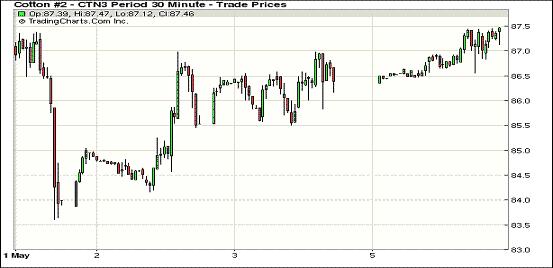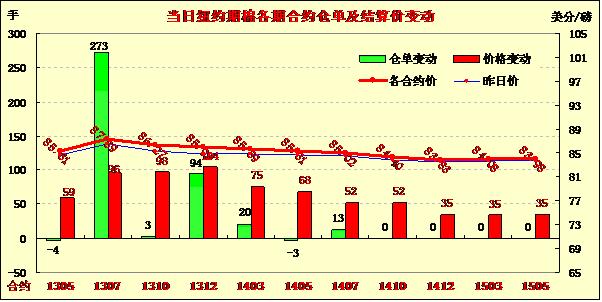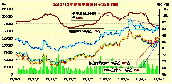 5月6日,美棉新花種植進(jìn)度緩慢及中國期市上漲促紐約期棉連續(xù)第三個交易日走高,近期5月合約結(jié)算價85.31美分/磅,漲59點(diǎn);主力7月合約結(jié)算價87.39美分/磅,漲96點(diǎn);12月合約結(jié)算價85.95美分/磅,漲104點(diǎn);其他遠(yuǎn)期合約漲幅35-75點(diǎn)不等。市場成交量縮小。當(dāng)日期棉平開高走,主力合約早盤短暫運(yùn)行在86.5美分/磅一線,后在市場炒作美棉種植進(jìn)度落后支持下一路上揚(yáng),中國鄭期收漲也對市場形成支持,該合約盤中最高至87.47美分,尾盤略有回落回吐部分漲幅,盤終連續(xù)第三個交易日收漲,三日累計(jì)漲352點(diǎn)。當(dāng)日美元指數(shù)走高,外部谷物市場普遍走低,原油市場收高。據(jù)美國農(nóng)業(yè)部(USDA),至5月5日,美棉新花播種率為17%,低于去年同期的35%及近五年平均值27%,東南及西南棉區(qū)雨水連綿導(dǎo)致進(jìn)度受阻,西南棉區(qū)仍受旱情困擾,這對期棉市場形成一定支持。