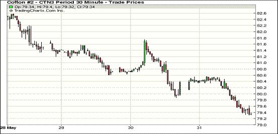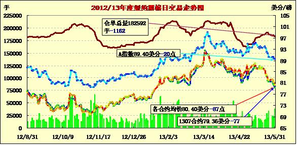 5月31日,受多頭平倉打壓,紐約期棉延續(xù)三年來最長跌勢全面走低,主力7月合約結算價79.36美分/磅,跌77點,5月份累計跌811點,跌幅8.1%,為八個月來最大月度跌幅;遠期12月合約結算價82.06美分/磅,跌77點;其他遠期合約跌幅在82-87點之間。當日市場平穩(wěn)開盤,主力7月合約早盤在80.4美分/磅一線震蕩,后多頭平倉打壓期棉下行,該合約失守80美分,當日最低至79.30美分/磅,盤終連續(xù)第9個交易日收跌,延續(xù)三年來最長連跌記錄。該合約當周累計跌213點;12月合約當周跌171點,遠期3月合約跌120點。