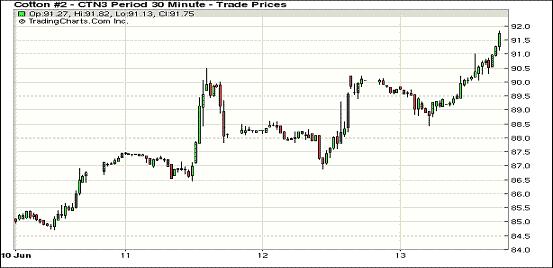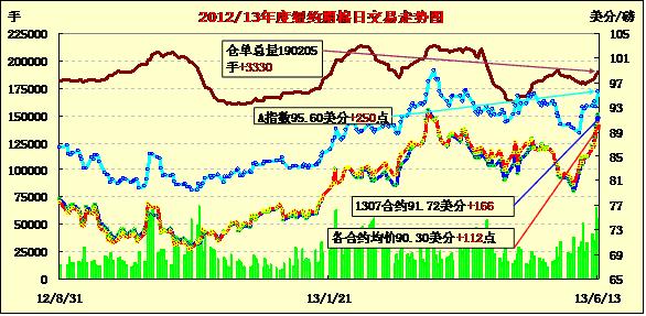 6月13日,中國以外地區(qū)對(duì)美棉需求強(qiáng)勁及美棉供應(yīng)吃緊促紐約期棉多數(shù)合約繼續(xù)收漲,近期7月合約結(jié)算價(jià)91.72美分/磅,漲166點(diǎn);主力12月合約結(jié)算價(jià)89.15美分/磅,漲108點(diǎn)。買賣雙方交投活躍,成交量超過6萬手。當(dāng)日市場平穩(wěn)開盤,近期7月合約早盤受賣盤打壓短暫下行,后美棉出口周報(bào)顯示中國以外地區(qū)需求強(qiáng)勁,但美棉供應(yīng)緊張促空頭回補(bǔ)買盤在近月合約7月9日到期前扶助推高價(jià)格,盤終該合約收于3月15日以來最高值。12月合約震蕩幅度285點(diǎn),結(jié)算價(jià)為2012年4月份以來最高值。據(jù)USDA,5.31-6.6一周美國凈簽約出口陸地棉22929噸,凈簽約下年度陸地棉22067噸,其中中國凈簽約本年度陸地棉8528噸,中國以外地區(qū)對(duì)美棉需求強(qiáng)勁。截至6月6日,本年度美棉簽約出口量約為預(yù)期出口總量的101%,裝運(yùn)占87%。