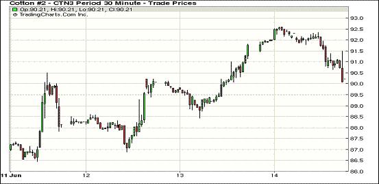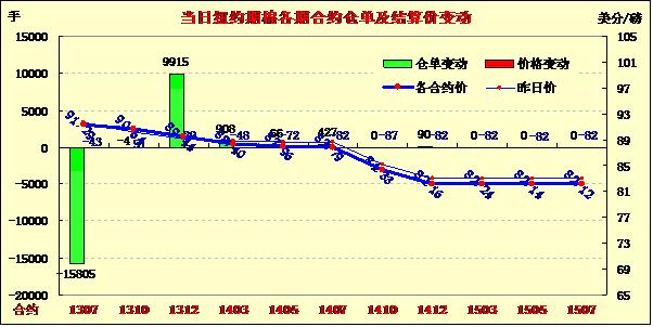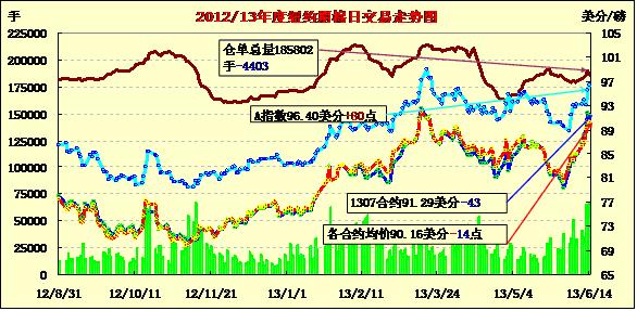 6月14日,紐約期棉漲跌互現(xiàn),近期7月合約結算價91.29美分/磅,跌43點;主力12月合約結算價89.44美分/磅,漲29點。本周市場成交持續(xù)活躍。當日近期7月合約小幅低開,早盤平穩(wěn)運行,下半場受賣盤打壓走低并以陰跌收盤。在商業(yè)買盤的支持下,12月合約過去三個交易日累計收漲429點。12/3月合約價差104點,為近一年來最高值。當日價差及指數(shù)基金移倉交易活躍。