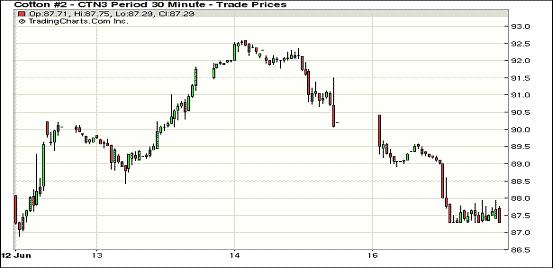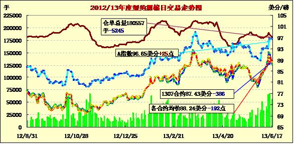 6月17日,紐約期棉前三份合約收跌,近期7月合約結(jié)算價(jià)87.43美分/磅,跌386點(diǎn);10月合約結(jié)算價(jià)89.04美分/磅,跌160點(diǎn);主力12月合約結(jié)算價(jià)88.99美分/磅,跌45點(diǎn);其他遠(yuǎn)期合約普遍小幅收漲。市場(chǎng)成交持續(xù)活躍。當(dāng)日近期7月合約早盤(pán)低開(kāi)(-88點(diǎn))并在89-89.5美分/磅之間震蕩,因臨近交割期,多頭平倉(cāng)打壓該合約大幅回落,盤(pán)中觸及跌停板87.29美分/磅(-400點(diǎn));交易后半段在87.5美分一線波動(dòng),盤(pán)終幾近跌停。主力12月合約當(dāng)日震蕩幅度208點(diǎn),盤(pán)終較7月合約升水156點(diǎn)。整體市場(chǎng)呈近弱遠(yuǎn)強(qiáng)格局,仍處于上行趨勢(shì)中。