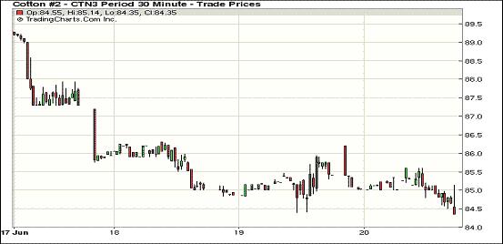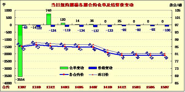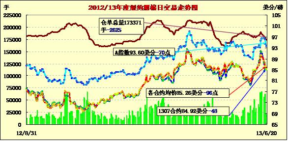6月20日,受市場對美聯(lián)儲撤出刺激計劃的擔(dān)憂加劇及中國經(jīng)濟(jì)數(shù)據(jù)疲軟打壓,ICE期棉隨同外部股市及商品市場全面收跌,近期7月合約結(jié)算價84.92美分/磅,跌48點;主力12月合約結(jié)算價85.36美分/磅,跌124點;其他遠(yuǎn)期合約跌幅92-137點不等。市場成交量大幅回落。當(dāng)日期棉微幅高開,主力12月合約早盤在85.5美分/磅上下波動,后投資者憂慮全球經(jīng)濟(jì)前景對市場形成壓力,期棉隨同外部市場一同走低,同時美棉出口簽約及裝運量下降,該合約一周來來首次跌破85美分,盤終雖略有反彈仍收于6月11日以來最低點,為連續(xù)第四個交易日收跌。7/12月合約價差縮小至44點。美聯(lián)儲主席貝南克19日重申,F(xiàn)ed可能于今年晚些時候開始縮減債券購買計劃;6月份匯豐(HSBC)中國制造業(yè)采購經(jīng)理人指數(shù)(PMI)的預(yù)覽指數(shù)降至48.3,5月份終值為49.2,這使得市場對全球經(jīng)濟(jì)前景擔(dān)憂重現(xiàn),拖累股市及商品市場全線下挫。