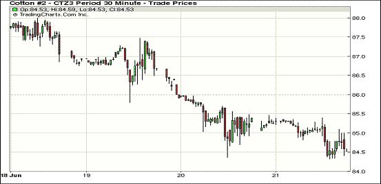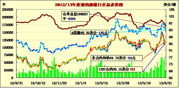 6月21日,受外部商品市場(chǎng)普跌、美國(guó)德州出現(xiàn)利好降雨及美棉簽約出口量下降等因素影響,紐約期棉除近期合約外均以陰跌收盤(pán),7月合約結(jié)算價(jià)85.15美分/磅,漲23點(diǎn);主力12月合約結(jié)算價(jià)84.64美分/磅,跌72點(diǎn);其他遠(yuǎn)期合約跌幅128-185點(diǎn)不等。當(dāng)日市場(chǎng)低開(kāi)低走,主力12月合約早盤(pán)在85美分/磅一線震蕩,午盤(pán)后外部商品市場(chǎng)走低拖累期棉下行,該合約連續(xù)第二日跌破85美分,盤(pán)終收于近兩周最低點(diǎn)。該合約本周連續(xù)五個(gè)交易日下跌,累計(jì)跌480點(diǎn)。