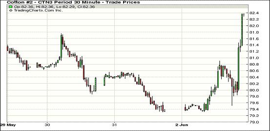 紐約期棉市場因前幾日連續(xù)下跌出現(xiàn)超賣,3日受買盤托底支持以強(qiáng)勁收漲結(jié)束九連陰,近期7月合約結(jié)算價82.36美分/磅,封于漲停板,12月合約84.32美分,漲226點(diǎn)。當(dāng)日7月合約早盤在80美分附近窄幅波動,盤中挑戰(zhàn)81美分失敗后繼續(xù)在早盤波動水平鞏固,交易尾段因買盤涌入尾盤封于漲停板。美元指數(shù)下跌,大豆等期貨市場上揚(yáng),期棉收益,同時,德州出現(xiàn)降雨,但整體旱情緩解有限,中南棉區(qū)密西西比和田納西因過多降雨種植進(jìn)度落后,期棉獲得更多支撐。分析師指出,市場前面九個交易日連續(xù)下跌已經(jīng)嚴(yán)重超賣,技術(shù)面上有反彈要求。
