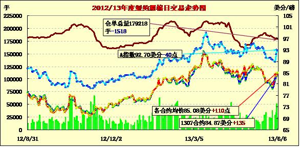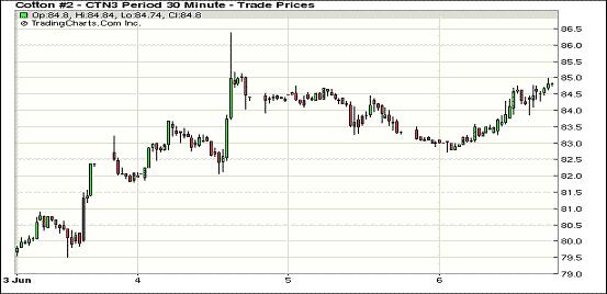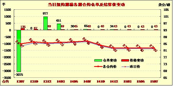 5月6日,紐約期棉市場反彈上揚,美棉出口周報利好對市場形成支持,近期7月合約結(jié)算價84.87美分/磅,漲135點,12月合約85.39美分,漲49點。當日7月合約低開后震蕩上揚,盤中試圖挑戰(zhàn)85美分失敗后在84.5美分一線窄幅波動,交易后期受美棉出口周報利好支撐穩(wěn)定于近高點,最終市場結(jié)束下跌全面上揚。外圍美元指數(shù)下跌,谷物期貨漲跌不一。據(jù)美國農(nóng)業(yè)部(USDA),5.24-5.30一周美國凈簽約出口本年度陸地棉41776噸,較前一周增57%,較近四周平均值增80%;裝運62732噸,較前一周減8%,較近四周平均值減1%;凈簽約本年度皮馬棉227噸,裝運6917噸,達到年度最高周裝運量,較前一周增77%,較近四周平均值增47%;凈簽約2013/14年度陸地棉31389噸?! ?nbsp;