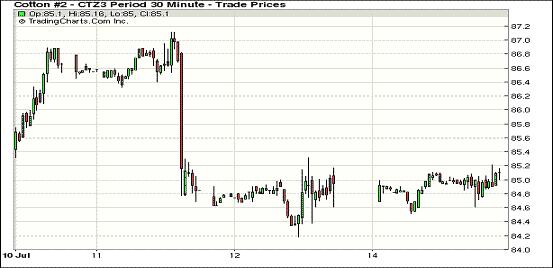 7月15日,紐約期棉近漲遠(yuǎn)跌,10月合約結(jié)算價(jià)85.35美分/磅,漲22點(diǎn);主力12月合約結(jié)算價(jià)85.10美分/磅,漲2點(diǎn);其他遠(yuǎn)期合約普遍小幅收跌,主要受美國(guó)德州將迎來(lái)利好降雨打壓。當(dāng)日市場(chǎng)中幅低開(kāi),主力12月合約早盤(pán)缺乏支持下行至當(dāng)日最低點(diǎn)84.52美分/磅,后買(mǎi)盤(pán)入市促該合約反彈,交易后半段整體在84.8-85.1美分之間震蕩,維持盤(pán)整格局。遠(yuǎn)期合約在市場(chǎng)炒作遭遇旱情的德州將迎降雨的消息下小幅收跌。分析指出,德州為美國(guó)最大產(chǎn)棉州,天氣預(yù)報(bào)說(shuō)該州將迎來(lái)強(qiáng)降雨,有助于提高單產(chǎn)和總產(chǎn),這對(duì)盤(pán)面上的遠(yuǎn)期合約構(gòu)成壓力。