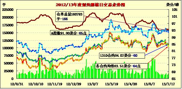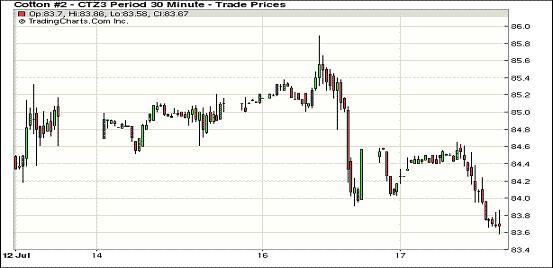 7月17日需求缺乏、技術(shù)性疲弱及德州旱情改善打壓紐約期棉繼續(xù)走低,近期10月合約收于84.07美分/磅,跌60點(diǎn);主力12月合約結(jié)算價(jià)83.67美分/磅,跌70點(diǎn);其他遠(yuǎn)期合約跌幅63-119點(diǎn)不等。當(dāng)日市場(chǎng)上半場(chǎng)運(yùn)行平穩(wěn),主力12月合約基本在84.4-84.6美分間震蕩,因缺乏買盤支持,同時(shí)技術(shù)性賣盤及德州旱情緩解對(duì)市場(chǎng)構(gòu)成壓力,該合約受拖累在下半場(chǎng)回落走低,盤終收6月27日以來(lái)最低值。遠(yuǎn)期3月合約與12月合約價(jià)差150點(diǎn)。