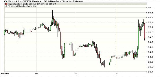 7月18日,紐約期棉在投機(jī)買盤支持下全面反彈,近期10月合約結(jié)算價(jià)84.99美分/磅,漲92點(diǎn);主力12月合約結(jié)算價(jià)84.85美分/磅,漲118點(diǎn);遠(yuǎn)期3月合約收于83.80美分/磅,漲121點(diǎn)。當(dāng)日期棉平穩(wěn)開盤,主力合約上半場(chǎng)主要在84-84.2美分/磅之間震蕩,美棉出口數(shù)據(jù)平平對(duì)市場(chǎng)影響不大,當(dāng)棉價(jià)跌至84美分一線時(shí),投機(jī)買盤及少量基本買盤入市促價(jià)格走高,該合約當(dāng)日最高至85.52美分/磅,盤終雖有所回落,但仍錄得7月1日以來(lái)最大單日漲幅。據(jù)美國(guó)農(nóng)業(yè)部(USDA),7.5-7.11一周美國(guó)凈簽約出口本年度陸地棉11431噸,裝運(yùn)29189噸。至本年度末,美棉每周需裝運(yùn)6.9萬(wàn)噸才能完成年度簽約量。