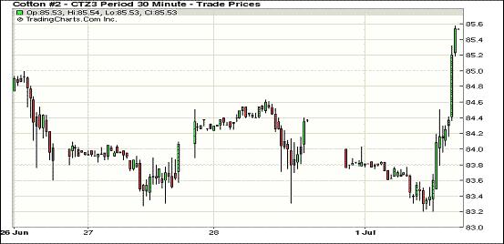 7月1日,受美國(guó)6月份PMI數(shù)據(jù)良好支持,美國(guó)股市、大豆及原油等商品市場(chǎng)收高,紐約期棉受提振也全線上揚(yáng),近期7月合約結(jié)算價(jià)84.29美分/磅,漲158點(diǎn);主力12月合約結(jié)算價(jià)85.54美分/磅,漲153點(diǎn);其他遠(yuǎn)期合約漲幅也均超過百點(diǎn)。當(dāng)日期棉平穩(wěn)開盤,主力12月合約當(dāng)日大部分時(shí)間在83-84美分/磅之間運(yùn)行,后美國(guó)經(jīng)濟(jì)數(shù)據(jù)利好推高外部股市及商品市場(chǎng),期棉也隨之走高,主力合約盤終收于6月19日以來最高值。市場(chǎng)成交仍較為清淡。據(jù)美國(guó)供應(yīng)管理學(xué)會(huì)公布,6月份美國(guó)制造業(yè)采購(gòu)經(jīng)理人指數(shù)(PMI)由5月份的49.0升至50.9,顯示制造業(yè)活動(dòng)擴(kuò)張,對(duì)股市及商品市場(chǎng)形成提振。投資者繼續(xù)關(guān)注歐洲央行在本周四召開的會(huì)議及美國(guó)將于周五公布的非農(nóng)就業(yè)報(bào)告。
