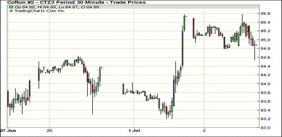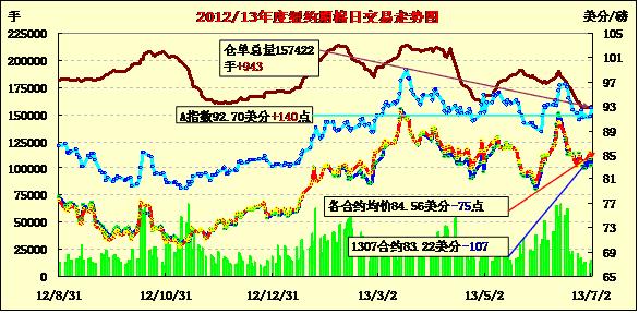 7月2日,紐約期棉未能延續(xù)前一日的強(qiáng)勢(shì)整體回落,近期7月合約結(jié)算價(jià)83.22美分/磅,跌107點(diǎn);主力12月合約結(jié)算價(jià)84.72美分/磅,跌82點(diǎn);其他遠(yuǎn)期合約普遍小幅收跌。當(dāng)日市場(chǎng)小幅低開(kāi),主力12月合約早盤(pán)圍繞85美分/磅左右震蕩,午盤(pán)后在買(mǎi)盤(pán)支持下上揚(yáng)至當(dāng)日最高點(diǎn)85.58美分/磅(+ 4點(diǎn)),后買(mǎi)盤(pán)獲利平倉(cāng)打壓市場(chǎng)回落,該合約以陰跌收盤(pán)。當(dāng)日市場(chǎng)交易較為清淡,因7月4日為美國(guó)獨(dú)立日,ICE期市將休市一天,節(jié)日氣氛已經(jīng)開(kāi)始蔓延,預(yù)計(jì)本周交易均以清淡為主。