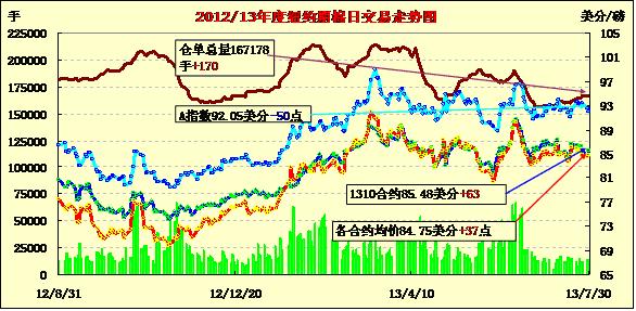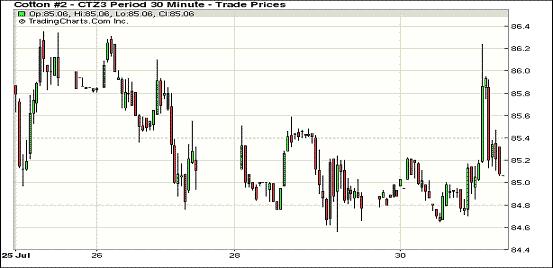 7月30日,受市場擔(dān)心美棉短期供應(yīng)偏緊支持,紐約期棉各合約反彈上漲,近期10月合約結(jié)算價85.48美分/磅,漲63點(diǎn);主力12月合約結(jié)算價85.14美分/磅,漲43點(diǎn);遠(yuǎn)期3月合約收于83.54美分/磅,漲83點(diǎn)。當(dāng)日期棉多數(shù)合約高開,早盤在85美分以下弱勢運(yùn)行,后投機(jī)買盤入市帶動市場快速反彈,主力12月合約繼25日之后再次突破86美分,當(dāng)日最高至86.24美分/磅,尾盤時分買盤獲利回吐部分漲幅,該合約收于85美分一線。分析指出,雖然本年度及下年度全球期末庫存處于高位,但由于目前美棉新花生長進(jìn)度落后,投資者擔(dān)心新花上市前市場供應(yīng)偏緊,這對期棉市場形成支持。