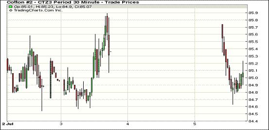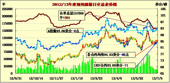 7月5日,在美元走強及新一期美棉出口簽約及裝運數(shù)據(jù)不佳的拖累下,紐約期棉全面下滑,近期7月合約結(jié)算價83.68美分/磅,跌71點;主力12月合約結(jié)算價85.03美分/磅,跌71點;其他遠(yuǎn)期合約跌幅96-103點不等。當(dāng)日市場開盤后一路走低,主力12月合約在午盤前后至當(dāng)日最低點84.57美分/磅,后在84.9美分一線震蕩,終以陰跌收盤。受前一日的美國獨立日假期影響,當(dāng)日市場成交極為清淡,成交量不足萬手。本周12月合約累計漲102點,3月合約漲145點。分析指出,美國6月份非農(nóng)就業(yè)人數(shù)增加195,000人,高于經(jīng)濟學(xué)家預(yù)計的160,000人,這促使美元走強,多數(shù)商品市場收跌。