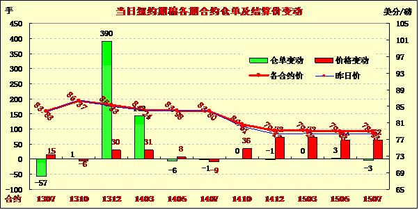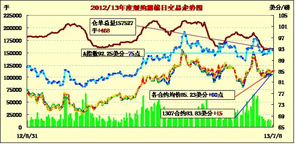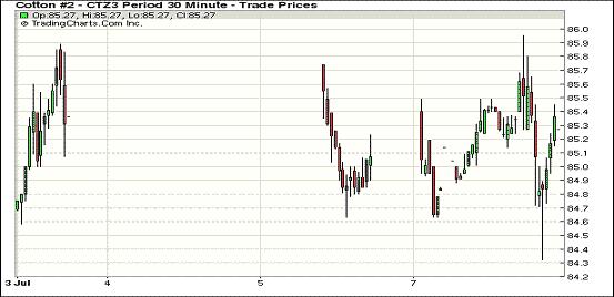 7月8日,在美元走軟、外部商品市場多數走高及非商業(yè)買盤的支持下,紐約期棉多數合約收漲,近期7月合約結算價83.83美分/磅,漲15點;主力12月合約結算價85.33美分/磅,漲30點。主力合約小幅高開,上半場在非商業(yè)買盤支持下震蕩走高,午盤前后至當日最高點85.95美分/磅(+92點);買盤獲利平倉打壓市場高點回落,交易尾段外部商品走高促期棉反彈,盤終該合約小幅收漲。市場成交量雖較上周有所增加,但仍較為清淡。