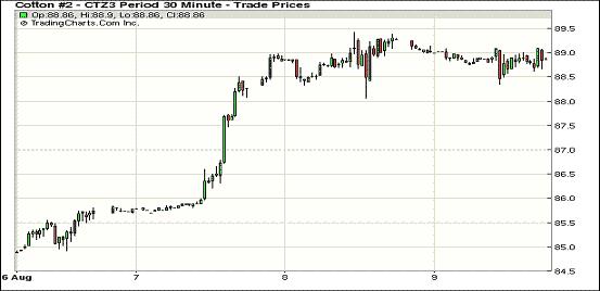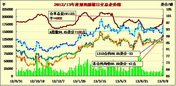 8月9日,紐約期棉未能延續(xù)前四個交易日的漲勢,在獲利平倉盤打壓下整體小幅回落,近期10月合約結算價89.05美分/磅,跌33點;主力12月合約結算價88.93美分/磅,跌32點;遠期3月合約收于86.88美分/磅,跌28點。當日期棉平穩(wěn)開盤,早盤窄幅震蕩,午盤前后在貿易商獲利平倉賣盤打壓下回落,主力12月合約至當日最低點88.35美分/磅,交易后半段有所反彈,盤終小幅收跌。當周近期3月合約累計漲373點,主力12月漲395點,1403月合約漲371點。本周期棉在市場炒作主產(chǎn)棉區(qū)天氣因素支持下整體收漲,繼續(xù)關注美國農業(yè)部(USDA)將于下周一發(fā)布的全球棉花供需預測報告。