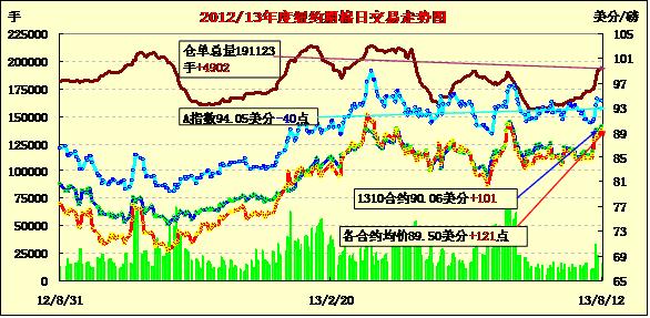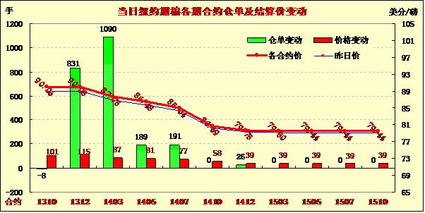 8月12日,美國農(nóng)業(yè)部8月份供需預(yù)測報告調(diào)低2013/14年度全球棉花產(chǎn)量及期末庫存,同時美國產(chǎn)量低于之前市場預(yù)期,紐約期棉受此支持大幅反彈,近期10月合約結(jié)算價90.06美分/磅,漲101點;主力12月合約結(jié)算價90.08美分/磅,漲115點;遠(yuǎn)期3月合約收于87.75美分/磅,漲87點。當(dāng)日期棉主力合約小幅低開,早盤延續(xù)上周五的跌勢繼續(xù)下行,后USDA供需預(yù)測報告利好促市場反彈上揚,該合約下半場突破90美分阻力位,當(dāng)日最高至90.39美分/磅,盤終在4月3日以來首次收于90美分之上。當(dāng)日外部商品市場也普遍上揚。據(jù)美國農(nóng)業(yè)部(USDA)最新預(yù)測,2013/14年度全球棉花總產(chǎn)2534萬噸,較7月份預(yù)測調(diào)減35.5萬噸;期末庫存2041.5萬噸,調(diào)減12.4萬噸。同時美國2013/14年度棉花產(chǎn)量較7月份調(diào)減9.7萬噸,至284.2萬噸;出口調(diào)減8.7萬噸,至230.8萬噸,這促使紐約期棉在當(dāng)日強(qiáng)勁反彈。