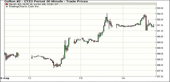 8月14日,紐約期棉遠(yuǎn)近合約普遍回落。近期10月合約結(jié)算價91.45美分/磅,跌14點(diǎn);主力12月合約結(jié)算價91.55美分/磅,跌17點(diǎn);遠(yuǎn)期3 月合約收于88.95美分/磅,跌55點(diǎn)。當(dāng)日期棉小幅低開,后持續(xù)低位震蕩,主力12月合約午盤后升至92.46美分的高位,最低跌至91.01美分,盤終時收回部分失地;期棉接連兩日大幅上揚(yáng)過后,大多買家選擇謹(jǐn) 慎。外部市場普遍走高。