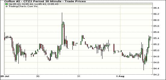 8月1日,市場(chǎng)棉花消息面平平,尾盤時(shí)技術(shù)性買盤促紐約期棉整體上漲反彈,近期10月合約結(jié)算價(jià)85.88美分/磅,漲25點(diǎn);主力12月合約結(jié)算價(jià)85.43美分/磅,漲25點(diǎn);遠(yuǎn)期3月合約收于83.58美分/磅,漲5點(diǎn)。 當(dāng)日主力12月合約早盤開(kāi)盤平穩(wěn),后快速下跌至兩周來(lái)新低(84.34美分),盤終時(shí)受技術(shù)性買盤支持有所反彈;外部谷物市場(chǎng)對(duì)期棉影響不大,美股及美元指數(shù)雙雙收高。市場(chǎng)等待即將公布的各項(xiàng)數(shù)據(jù)報(bào)告,尤其是美國(guó)農(nóng)業(yè)部棉花供需預(yù)測(cè)報(bào)告,預(yù)計(jì)產(chǎn)量和期末庫(kù)存等方面將有所提高。