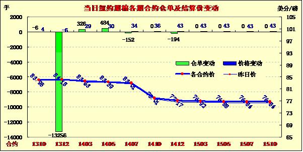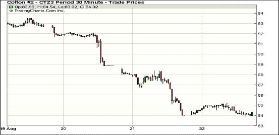 8月22日,繼連續(xù)兩日大跌之后,紐約期棉除主力12月合約外,大部分合約小幅上漲;近期10月合約結算價83.95美分/磅,漲4點;主力12月合約結算價84.18美分/磅,跌6點;遠期3月合約收于83.63美分/磅,漲29點。當日主力12月合約早盤開盤后有所回落,最低下跌116點并跌破84.00美分,后受美棉出口周報利好消息反彈回升,盤終時回吐部分所得,前一日期棉大跌近500點主要原因為投機者離場,同時也創(chuàng)下14個月來最大單日跌幅。印度棉花種植面積高于預期,美棉產量持續(xù)下滑等因素致期棉近期下跌;貿易商等待市場下一步走向。