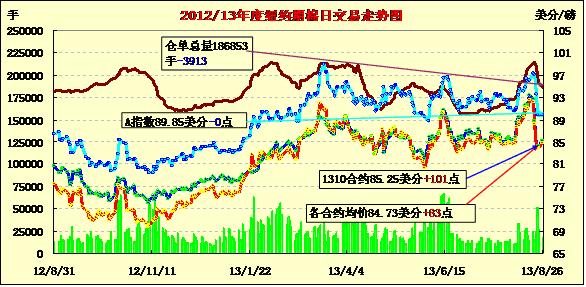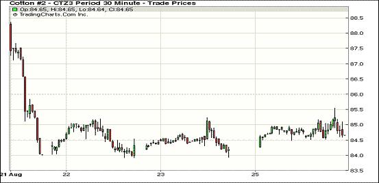 8月26日,紐約期棉遠近合約普遍上漲;近期10月合約結(jié)算價85.25美分/磅,漲101點;主力12月合約結(jié)算價84.90美分/磅,漲82點;遠期3月合約收于84.05美分/磅,漲55點。當(dāng)日遠近合約普遍高開,午盤時均大幅上漲,主力12月合約在84-86美分之間震蕩,受玉米和大豆等外部谷物市場價格大幅飆升帶動,投機買家入場帶動期棉上漲。分析指出,美國格蘭德河流域棉花采摘,德州平原出現(xiàn)利好降雨,加州SJV流域棉花進度加快等利好消息,一并促成26日期棉價格上漲走勢。不過27日期棉價格可能遭受壓力,因為美棉苗情報告顯示,生長狀況良好的棉花比例由上周的46%升至47%。