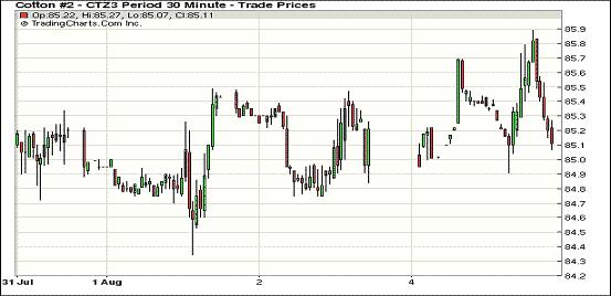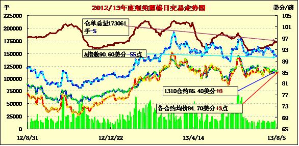 8月5日,紐約期棉各合約止跌反彈小幅收漲,近期10月合約結(jié)算價85.40美分/磅,漲8點(diǎn);主力12月合約結(jié)算價85.20美分/磅,漲22點(diǎn);遠(yuǎn)期3月合約收于83.45美分/磅,漲28點(diǎn)。市場成交量較前一日有所放大。當(dāng)日主力12月合約小幅高開,當(dāng)日整體在85美分以上震蕩,午盤后跌至當(dāng)日最低點(diǎn)84.91美分(-7點(diǎn)),后在市場多空力量角力下微幅收高。10月合約上漲超過上周五的85.48美分高點(diǎn),最高升至85.89美分,后有所回落。當(dāng)日外部商品市場整體下滑。當(dāng)日印度向市場投放更多儲備棉與其產(chǎn)棉區(qū)遭受雨水損害多空消息抵消,對市場影響不大。在7月23日到8月5日之間的10個交易日內(nèi),12月合約在84.71-85.99美分/磅之間震蕩,預(yù)計(jì)在美國農(nóng)業(yè)部8月份供需預(yù)測報告公布前,該合約繼續(xù)在此區(qū)間內(nèi)盤整。