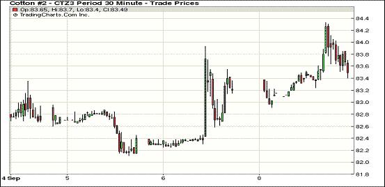 9月9日,紐約期棉遠(yuǎn)近合約延續(xù)前一日漲勢繼續(xù)上行;近期10月合約結(jié)算價(jià)83.71美分/磅,漲47點(diǎn);主力12月合約結(jié)算價(jià)83.50美分/磅,漲29點(diǎn);遠(yuǎn)期3月合約收于83.05美分/磅,漲46點(diǎn)。當(dāng)日期棉早盤高開,主力12月突破84美分高位最高至84.33美分,盤終時(shí)有所回吐,市場成交量有限;外部谷物市場漲跌不一,大豆和玉米下跌,美元大幅下跌。上周的美棉出口報(bào)告對(duì)紐約期棉持續(xù)形成利好,市場繼續(xù)關(guān)注本周相關(guān)數(shù)據(jù)。