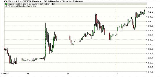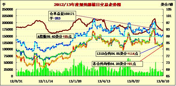 上周持續(xù)于82美分上下震蕩過(guò)后,9月10日技術(shù)性買盤繼續(xù)支持紐約期棉連續(xù)第三日上漲;近期10月合約結(jié)算價(jià)84.85美分/磅,漲114點(diǎn);主力12月合約結(jié)算價(jià)84.47美分/磅,漲97點(diǎn);遠(yuǎn)期3月合約收于83.76美分/磅,漲71點(diǎn)。當(dāng)日期棉早盤延續(xù)前一日行情繼續(xù)高開(kāi),主力12月在84美分之上徘徊,盤終時(shí)大幅上漲,由于市場(chǎng)等待周四發(fā)布的美棉出口報(bào)告,市場(chǎng)成交量仍較為有限。