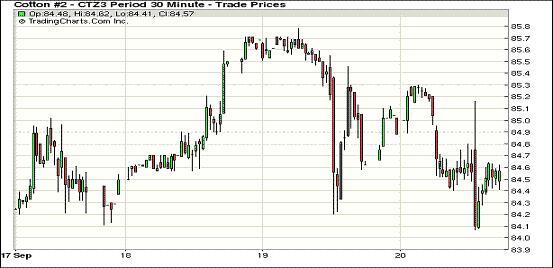 9月20日,受美元走高影響,紐約期棉隨同外部商品市場一同走低,近期10月合約結算價83.33美分/磅,跌201點;主力12月合約結算價84.52美分/磅,跌20點;遠期3月合約收于84.41美分/磅,跌5點。當日12月合約平開后小幅上揚,在85.2美分一線短暫震蕩,后受外部商品市場走低拖累下滑至84.6美分一線并延續(xù)至盤終。市場交易清淡,成交量不足萬手。