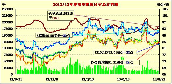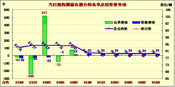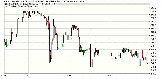 9月23日期棉漲跌不一,近期合約普遍持續(xù)下跌;近期10月合約結(jié)算價(jià)83.01美分/磅,跌32點(diǎn);主力12月合約結(jié)算價(jià)84.27美分/磅,跌25點(diǎn);遠(yuǎn)期3月合約收于84.18美分/磅,跌23點(diǎn)。當(dāng)日棉花消息面平平,期棉開盤延續(xù)前一日走勢(shì)小幅上漲,主力12月合約在84.07-85.3美分之間震蕩,盤終時(shí)下跌32點(diǎn)收于83.01美分,遠(yuǎn)期合約普遍上漲。分析指出,市場(chǎng)缺乏投資者信心支持,不過美元走弱及周二苗情報(bào)告為期棉提供部分支撐,全球棉花供應(yīng)吃緊及中國(guó)棉花政策仍對(duì)市場(chǎng)形成負(fù)面影響。