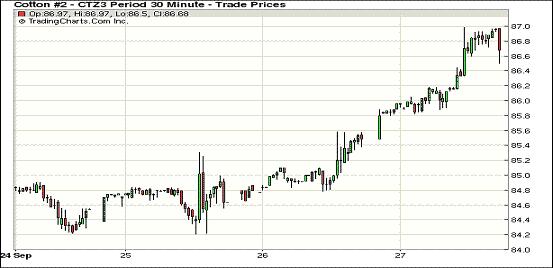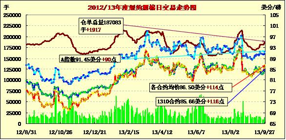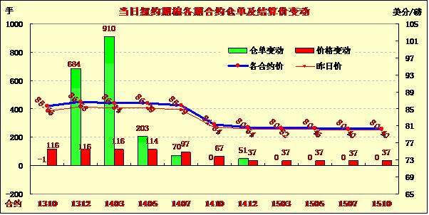 9月27日,受市場買盤量增加及美棉生長狀況引發(fā)投資者擔(dān)憂等因素影響,期棉連續(xù)第四日上漲,主力12月合約漲幅明顯;近期10月合約結(jié)算價85.66美分/磅,漲116點(diǎn);主力12月合約結(jié)算價86.63美分/磅,漲116點(diǎn);遠(yuǎn)期3月合約收于86.34美分/磅,漲116點(diǎn)。當(dāng)日期棉遠(yuǎn)近合約早盤高開高走,主力12月合約漲至自8月中以來高點(diǎn),市場成交量持續(xù)放大,外部市場漲跌不一。分析指出,美棉生長預(yù)期不斷下滑,全球市場需求保持低位;此外中國實(shí)行新的進(jìn)口配額政策及印度新花受降雨影響質(zhì)量下降也是當(dāng)日期棉上漲主因。