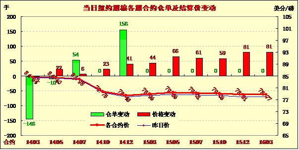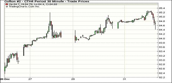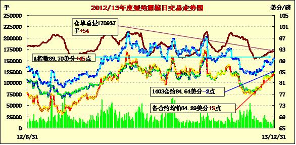 2013年最后一個交易日,紐約期棉除1403月合約微跌外,其他合約普遍收漲。143月合約結(jié)算價84.64美分/磅,跌2點;1405月合約結(jié)算價84.40美分/磅,漲22點;其他遠(yuǎn)期合約漲幅6-81點不等。市場在元旦節(jié)假期之前成交仍較平淡。期棉當(dāng)日運行整體平穩(wěn),在技術(shù)買盤、投機買盤及美棉供應(yīng)偏緊等因素支持下,主力3月合約連續(xù)第三日突破85美分阻力位,但尾盤時分買盤獲利平倉致該合約盤終微跌。