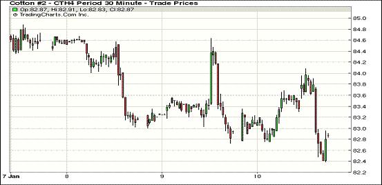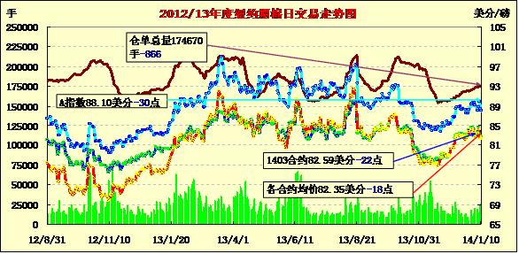1月10日,因USDA月報(bào)調(diào)高本年度全球棉花產(chǎn)量及庫存,紐約期棉承壓連續(xù)第三個(gè)交易日收跌,1403月合約結(jié)算價(jià)82.59美分/磅,跌22點(diǎn);1405月合約結(jié)算價(jià)82.74美分/磅,跌7點(diǎn)。市場(chǎng)成交量突破三萬手。當(dāng)日期棉平穩(wěn)較為平穩(wěn),主力3月合約上半場(chǎng)持續(xù)上揚(yáng),午盤后至當(dāng)日最高點(diǎn)84.08美分(+127點(diǎn)),后USDA全球棉花預(yù)測(cè)報(bào)告利空打壓市場(chǎng)下行,該合約盤終收于2013年10月23日以來最低值,該合約本周累計(jì)跌35點(diǎn),1405月合約累計(jì)跌19點(diǎn),1407月合約跌45點(diǎn),14012月合約跌45點(diǎn)。據(jù)USDA昨晚最新預(yù)測(cè),本年度全球棉花產(chǎn)量2565萬噸,較上次預(yù)測(cè)增21萬;消費(fèi)2384萬,減4萬;期末庫存2125萬,增26萬,這對(duì)期棉市場(chǎng)形成壓力。