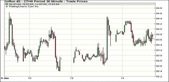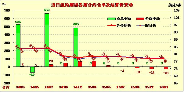 1月14日,因市場消息平淡,紐約期棉近月合約繼前一日大幅上揚后呈調(diào)整格局,1403月合約結(jié)算價83.73美分/磅,漲5點;1405月合約結(jié)算價84.02美分/磅,漲77點。14年度新花漲幅在17-73點不等,市場成交量較前幾日有所下滑。期棉當(dāng)日小幅低開,主力3月合約開盤后在84.2美分/磅震蕩,當(dāng)日最高至84.31美分,賣盤入市打壓市場高處回落,該合約至當(dāng)日最低點83.34美分,震蕩區(qū)間97點;因缺乏市場方面消息指引,該合約交易后半段主要在83.6美分一線上下波動,盤終微幅上揚。當(dāng)日外部大豆、小麥及原油期貨收漲,玉米市場走低。