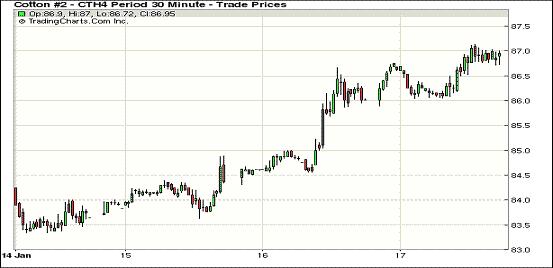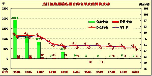 1月17日,在技術(shù)性買盤及市場(chǎng)擔(dān)憂美棉庫(kù)存偏緊支持下,紐約期棉繼續(xù)收漲,主力1403月合約收于86.80美分/磅,漲61點(diǎn);1405月合約結(jié)算價(jià)87.05美分/磅,漲65點(diǎn);其他遠(yuǎn)期合約漲幅3-49點(diǎn)不等。下周一期棉市場(chǎng)將因馬丁路德日假期休市一天。期棉當(dāng)日整體運(yùn)行平穩(wěn),主力合約主要圍繞86.50美分/磅震蕩,當(dāng)日最高至87.14美分,盤終雖略有回落但仍收于2013年10月4日以來(lái)最高值。本周1403月合約累計(jì)漲421點(diǎn),1405月合約漲421點(diǎn),1407月合約漲389點(diǎn),1412月合約漲243點(diǎn)。盡管全球棉花庫(kù)存大增施壓市場(chǎng),但因美棉出口銷售活躍,市場(chǎng)擔(dān)心美國(guó)棉花供應(yīng)緊張,這對(duì)期棉形成支持。