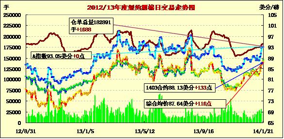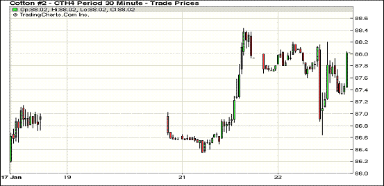 1月22日,受技術性賣盤打壓,紐約期棉結束六連漲普遍下跌。主力3月合約收于87.84美分/磅,跌29點;5月合約結算價88.01美分/磅,跌39點;1407月合約收于87.67美分/磅,跌24點。當日期棉開盤后短暫沖高回落,最高漲至88.2美分/磅,午盤后跌至86.64美分/磅低點,盤終前有所反彈,成交額較前一日大幅減少。期棉觸及88美分以上強壓力區(qū)域,引發(fā)獲利平倉導致棉價下跌,不過后市仍有望繼續(xù)上漲,市場關注推遲至周五發(fā)布的美棉出口周報。