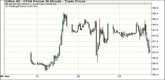 1月23日,受中國拋儲供應預期增加將抑制棉價及市場技術(shù)性拋盤打壓,紐約期棉連續(xù)第二日收跌。主力3月合約收于87.33美分/磅,跌51點;5月合約結(jié)算價87.61美分/磅,跌40點;1407月合約收于87.54美分/磅,跌13點。當日期棉開盤平穩(wěn),盤終前后受技術(shù)性拋盤影響整體快速下跌,主力3月合約震蕩區(qū)間87.15-88.15美分/磅,外部市場玉米大豆上漲未對期棉產(chǎn)生拉動影響。