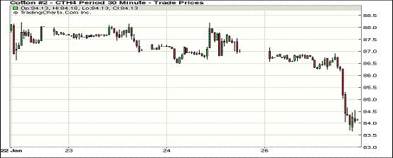 1月27日,紐約期棉連續(xù)第四日下跌,近期合約跌幅均在200點(diǎn)以上。主力3月合約收于84.25美分/磅,跌296點(diǎn);5月合約結(jié)算價(jià)84.71美分/磅,跌278點(diǎn);1407月合約收于84.76美分/磅,跌265點(diǎn)。當(dāng)日期棉開(kāi)盤(pán)后快速下跌,主力3月合約在21日漲至5個(gè)月高位后連續(xù)四日收跌,市場(chǎng)賣(mài)盤(pán)壓力對(duì)期棉形成打壓,總成交量為11月13日以來(lái)新高,主力合約震蕩區(qū)間83.66-87.16美分/磅。春節(jié)過(guò)后中國(guó)政府可能繼續(xù)加大拋儲(chǔ),棉花直補(bǔ)將對(duì)全球棉價(jià)形成壓力,關(guān)注82美分支撐位。