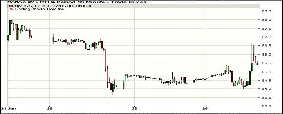 1月29日,期棉近期合約大幅上漲,遠(yuǎn)期合約普遍小跌;主力3月合約結(jié)算價(jià)85.55美分/磅,漲120點(diǎn);1405月合約收于86.24美分/磅,漲139點(diǎn);1407月合約收于86.30美分/磅,漲137點(diǎn)。當(dāng)日期棉早盤后普遍上漲,主力合約震蕩區(qū)間84-86.61美分/磅,盤終近期合約上漲,遠(yuǎn)期下跌,外部市場(chǎng)玉米大豆下跌。美棉出口需求利好持續(xù)為近期合約價(jià)格提供支撐,中國政策變化將為市場(chǎng)需求及價(jià)格帶來巨大影響。
