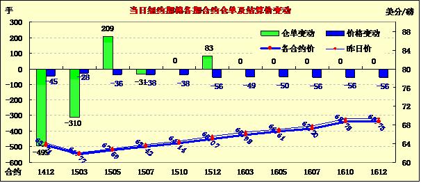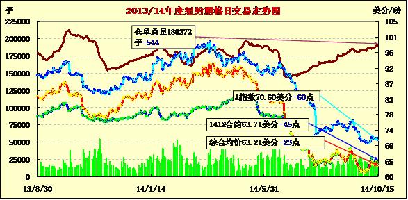 10月15日,受市場(chǎng)賣(mài)盤(pán)影響,期棉延續(xù)前一日跌勢(shì)繼續(xù)收跌;主力1412月合約結(jié)算價(jià)63.71美分/磅,跌45點(diǎn);遠(yuǎn)期1503月合約收于61.77美分/磅,跌28點(diǎn)。期棉當(dāng)日開(kāi)盤(pán)后延續(xù)前一日走勢(shì)整體下滑,主力合約震蕩區(qū)間63.29-64.46美分/磅,盤(pán)終收于10月3日來(lái)低點(diǎn),12/3月價(jià)差縮至194點(diǎn);商品市場(chǎng)玉米、大豆等期貨下跌,美元指數(shù)跌幅明顯。全球整體供需情況不變,棉價(jià)延續(xù)看空走勢(shì)。國(guó)際棉價(jià)持續(xù)下跌,多國(guó)推出產(chǎn)業(yè)扶持政策。