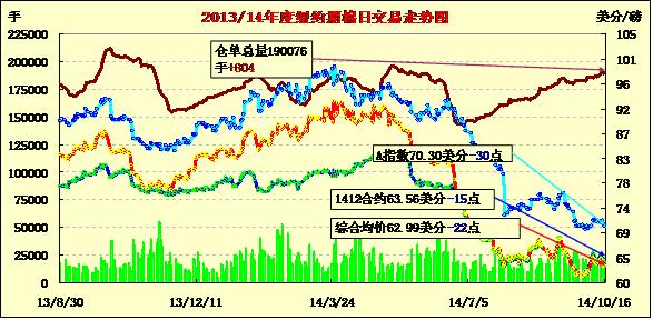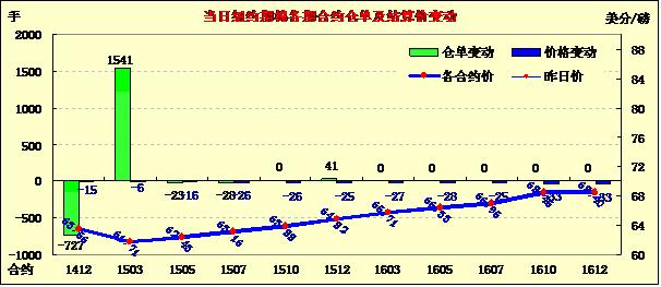 10月15日,棉花消息面有限,紐約期棉繼續(xù)下跌;主力1412月合約結(jié)算價(jià)63.56美分/磅,跌15點(diǎn);遠(yuǎn)期1503月合約收于61.71美分/磅,跌6點(diǎn)。當(dāng)日期棉開盤后短暫上漲,后在投資者獲利平倉(cāng)壓力下持續(xù)下行,主力12月合約最高突破64美分,12/3月價(jià)差185點(diǎn);外部商品市場(chǎng)玉米和大豆及原油上漲,經(jīng)歷多日震蕩過程后,美股昨日上漲,美元指數(shù)下跌。近兩日棉花相關(guān)消息多為長(zhǎng)期影響棉價(jià)走勢(shì)的全球產(chǎn)量和庫(kù)存增加預(yù)期,國(guó)際棉價(jià)仍有進(jìn)一步下跌空間,上周美棉出口數(shù)據(jù)推遲至今晚發(fā)布。