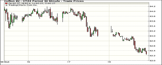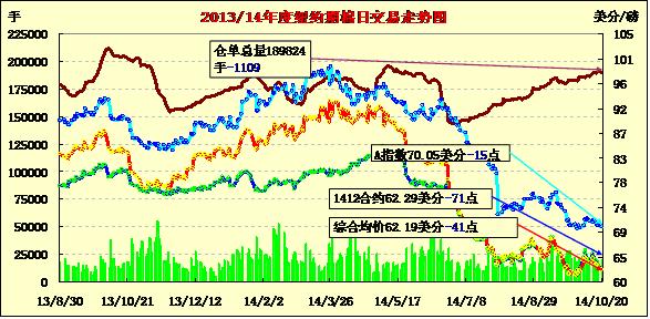 10月20日,美國(guó)和印度新花上市,高庫(kù)存及銷售不暢打壓市場(chǎng),期棉繼續(xù)下行,主力合約連續(xù)第五個(gè)交易日收跌;主力1412月合約結(jié)算價(jià)62.29美分/磅,跌71點(diǎn);遠(yuǎn)期1503月合約收于61.70美分/磅,跌3點(diǎn)。當(dāng)日期棉低開(kāi)低走,盤終主力合約承壓五連跌,震蕩區(qū)間62.23-63.40美分/磅,12/3月價(jià)差進(jìn)一步縮小至59點(diǎn),外部市場(chǎng)玉米和大豆收跌。