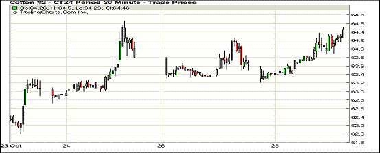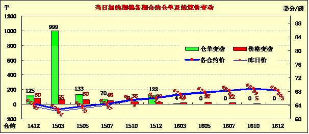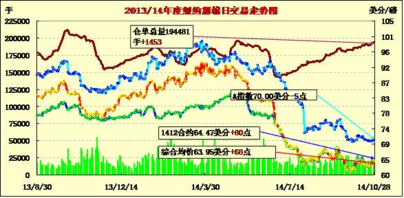 10月28日,紐約期棉遠(yuǎn)近合約均普遍上漲;主力1412月合約結(jié)算價(jià)64.47美分/磅,漲80點(diǎn);遠(yuǎn)期1503月合約收于62.84美分/磅,漲65點(diǎn)。當(dāng)日期棉開(kāi)盤(pán)后持續(xù)震蕩上行,由63.21漲至64.50美分,盤(pán)終收漲80點(diǎn),收于兩周多來(lái)高點(diǎn),12/3月價(jià)差163點(diǎn);外部商品市場(chǎng)美股指數(shù)、玉米和大豆期貨上漲。至上周美棉新花采摘率42%,隨棉區(qū)集中采摘進(jìn)度加快,棉價(jià)將會(huì)遭遇下行壓力。