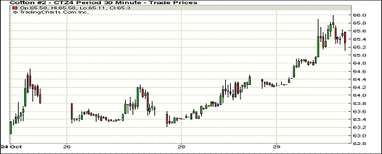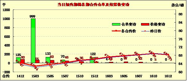 10月29日,投資者空頭回補(bǔ)和外部商品市場(chǎng)走勢(shì)強(qiáng)勁促紐約期棉連續(xù)第三個(gè)交易日上漲;主力1412月合約結(jié)算價(jià)65.35美分/磅,漲88點(diǎn);遠(yuǎn)期1503月合約收于63.22美分/磅,漲38點(diǎn)。當(dāng)日期棉開(kāi)盤后延續(xù)前一日走勢(shì)持續(xù)上漲,主力12月合約漲至9月17日以來(lái)高點(diǎn),盤終收于65美分/磅以上,12/3月價(jià)差213點(diǎn);外部市場(chǎng)玉米和大豆上漲,美元指數(shù)下跌。受供應(yīng)資源緊張影響,紐約期棉短期內(nèi)將維持震蕩反彈走勢(shì),但受制于全球供應(yīng)過(guò)剩及消費(fèi)下降,反彈難以持續(xù),后市不可追漲。