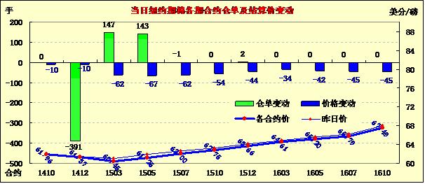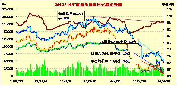 9月30日,市場賣盤壓力打壓棉價再度跌至歷史新低;1410月合約結(jié)算價61.96美分/磅,跌10點(diǎn);主力1412月合約結(jié)算價61.37美分/磅,跌10點(diǎn);遠(yuǎn)期1503月合約收于60.45美分/磅,跌62點(diǎn)。當(dāng)日期棉開盤后延續(xù)震蕩走勢,整體小幅上漲,盤終前一小時受市場賣盤壓力轉(zhuǎn)而下跌,盤終近期合約小幅下跌,主力合約再創(chuàng)歷史新低;外部市場玉米、大豆和小麥下跌。中美發(fā)布數(shù)據(jù)報告顯示經(jīng)濟(jì)前景均不佳,此外隨美棉采摘量增加,再加上印度棉預(yù)計增產(chǎn),期棉價格將會進(jìn)一步承壓,關(guān)注下一支撐位60美分。