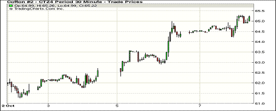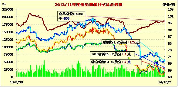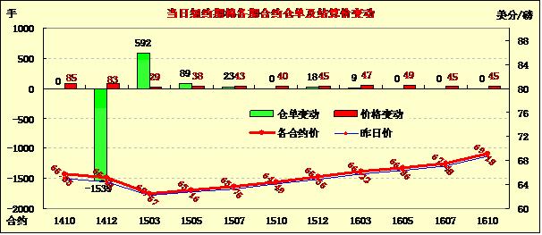 10月7日,受市場(chǎng)供應(yīng)吃緊壓力,紐約期棉延續(xù)前一日漲勢(shì),收于兩周來(lái)高點(diǎn);主力1412月合約結(jié)算價(jià)65.21美分/磅,漲83點(diǎn);遠(yuǎn)期1503月合約收于62.57美分/磅,漲29點(diǎn)。期棉在當(dāng)日開(kāi)盤(pán)后震蕩上行,遠(yuǎn)近合約均普遍上漲,主力12月合約漲至65.29美分高位,盤(pán)終收于65美分之上,12/3月價(jià)差264點(diǎn);市場(chǎng)短期供應(yīng)不足、新花采摘推遲以及主產(chǎn)區(qū)天氣條件堪憂等因素推高棉價(jià)。北三角洲地區(qū)出現(xiàn)風(fēng)暴天氣,局部地區(qū)冰雹,亞利桑那州采摘落后于去年同期,不過(guò)由于新棉即將上市,遠(yuǎn)期棉價(jià)仍面臨巨大下行壓力。