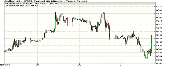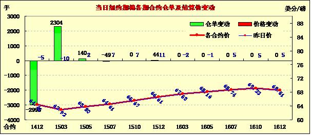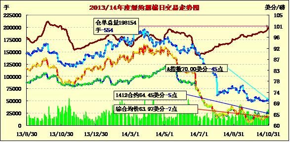 10月最后一個交易日,紐約期棉漲跌互現(xiàn);主力1412月合約結算價64.45美分/磅,跌5點;1503月合約收于62.92美分/磅,跌10點。當日期棉開盤后連續(xù)第二天低開低走,主力合約未能守住65美分/磅關點,最低跌至63.26美分/磅,盤終微幅下跌,12/3月價差153點。美棉采摘工作全面展開,預計期棉將承壓,結束近期震蕩上漲行情。